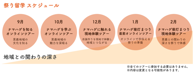 祭り開催以前のアクティビティを通じて祭りや地域に興味を持つ地域のファン(関係人口)を生み出し、新しい祭り参加や地域との関わり方を生み出すために、男鹿市のナマハゲをテーマに一連のツアープログラムとして開催された『祭り留学』は、今回の修了式をもって終了となりました。年間を通して計5回の開催となった祭り留学は、オンラインでの参加から複数回の現地訪問へとつながる動機付けができるコンテンツとして効果を検証することができました。