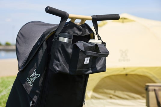 DADWAYの店頭でもアウトドア派から支持される国産ベビーカーのCURIOに、DODの遊び心あるテイストを落とし込んだ一台。大型のノーパンクタイヤで段差もスイスイ乗り越えられ、ハンドルから前輪まで一直線のストレートフレーム構造が滑らかな押し心地を実現。悪路の多いキャンプやフェスでもタフにお使いいただけます。サスペンションやハンモック構造のシートでお子さまも快適です。DODロゴ入りのオリジナルバスケットに、レインカバー、ハンドルバッグと、購入特典として充実のアクセサリーをプレゼントいたします。