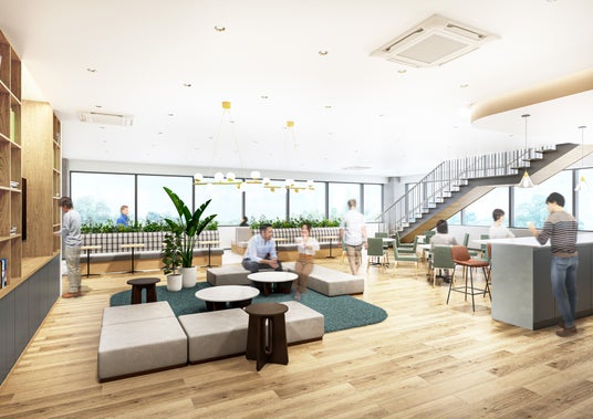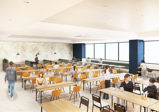 また、4号棟には福利厚生エリアを新設いたしました。食堂スペースと休憩スペースをそれぞれ1フロアずつ設け、吹き抜けの階段で行き来でき、従業員が心からリラックスできるよう、快適な空間づくりにこだわりました。空間デザインにあたっては、従業員アンケートを実施し、その結果を反映したナチュラルな木質感やグリーンを取り入れ、心地よい雰囲気を演出しております。