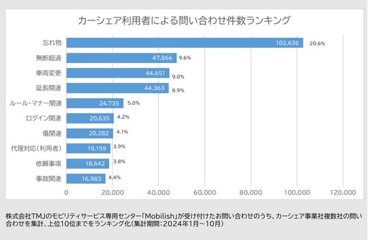 コールセンター・バックオフィス(事務処理センター)の構築・運営を行うセコムグループの株式会社TMJ(本社:東京都新宿区、代表取締役社長執行役員:丸山 英毅、以下TMJ)は、自社で運営するモビリティビジネス専門のコンタクトセンター「Mobilish(モビリッシュ)」において、2023年から2024年までの期間でカーシェアリングサービス利用者が問い合わせ内容を集計、ランキング化したデータを公開いたします。