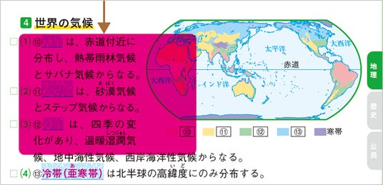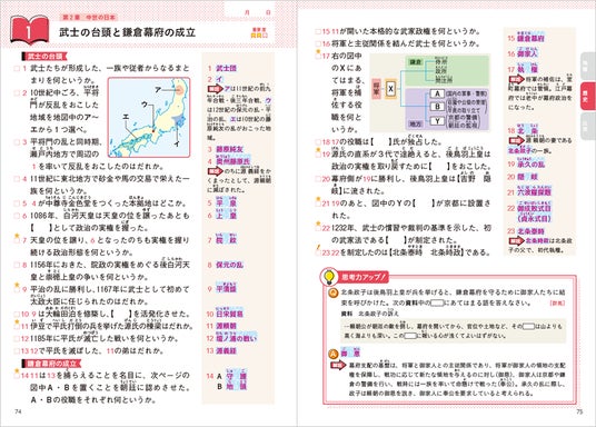 1単元を2ページにまとめ、いつも手元におけるコンパクトなB6サイズ。スキマ時間を使って取り組みやすく、消えるフィルターを使って何度も問題にチャレンジしていくうちに重要事項が定着していきます。