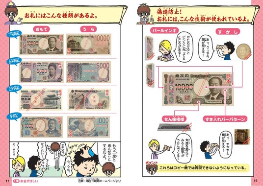 「お金はどこからくるのか」ということから、「クレジットカードの使い方」まで、楽しいストーリーで楽しくお金のしくみを学べる『お金のこと』が、2024年7月3日より発行される新紙幣に対応して改訂されます。新紙幣のデザインや偽造防止に使われている技術のほか、新紙幣に描かれている人物の業績についても紹介しています。
