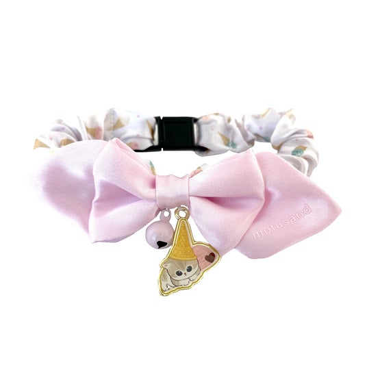 ペットの首元をかわいく彩る、チャーム付きリボンです。 サメにゃん、アイスにゃん、はちにゃんの3種類展開。
