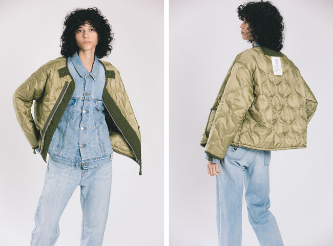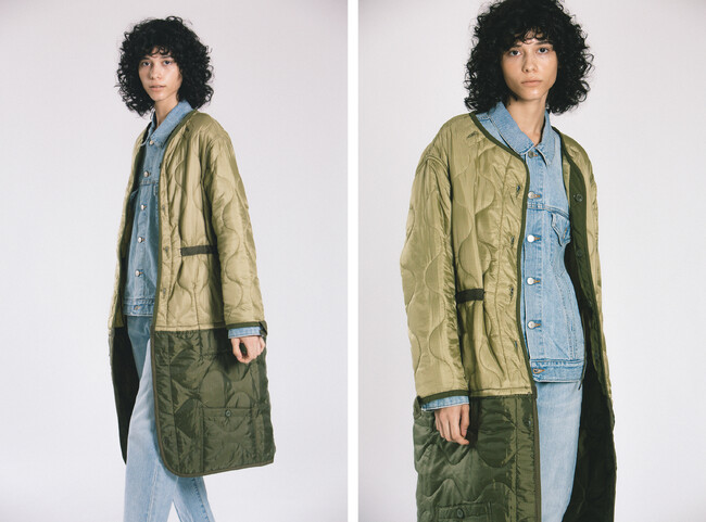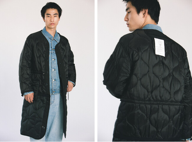 ライナーコートとして1枚での着用はもちろん、M-65 PARKA SHELLのライナーとして着用可能で、裾から少しライナーがのぞくレイヤードスタイルが楽しめます。