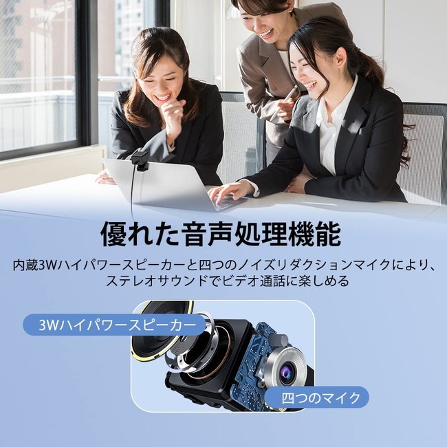 Webカメラ本体に四つマイク& 3Wハイパワースピーカーを搭載した構造を採用し、音声がよりはっきりに大音量で伝えることができます。また、「ノイズリダクション機能」付き、通信相手への均一でクリアな音声送信を実現し、より高音質でかつ滑らかなビデオ会話体験を得ることができます。