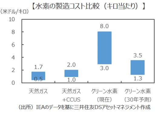 ■『グリーン水素』の普及にとって最大のハードルは、製造コストの高さです。現在のコストはキロ当たり3~8ドルと、天然ガス由来の0.5~1.7ドル(CCUSとセットで1~2ドル)と比べて割高な水準にあります。