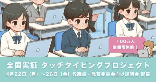 自治体向けサービスを開発する株式会社ミラボ(本社:東京都千代田区、代表取締役:谷川一也、以下「ミラボ」)と、情報モラル教育・プログラミング教育を手がける株式会社教育ネット(本社:神奈川県横浜市、代表取締役:大笹いづみ、以下「教育ネット」)は、共同開発したクラウド型デジタルAI教材「らっこたん」を使用し、日本全国の小中学生のタイピングスキルアップを図ることを目的とした「〈 全国実証 〉タッチタイピングプロジェクト(以下「本プロジェクト」を開始します。大規模実証実験のためユーザー数100万人まで無期限無償で「らっこたん」をご利用いただけます。