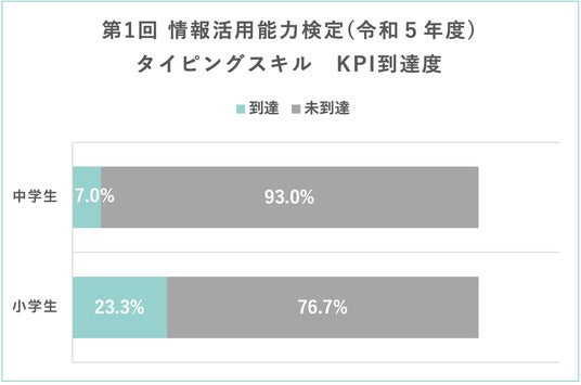 これまでに日本全国の延べ44,687人の児童生徒が参加した「らっこたん」を使用した「タイピングスキル検定(旧全国統一タイピングスキル調査)」の日本語入力スキルを見てみると2026年KPI相当を超える入力文字数の割合は小学生で23.3%、中学生で7.0%でした。