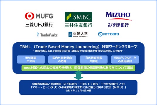 株式会社トレードワルツ(本社:東京都港区、代表取締役社長:佐藤 高廣、以下、トレードワルツ)は、2025年12月4日に、財務省関税局と三菱UFJ銀行・三井住友銀行・みずほ銀行の3メガバンクの間で「マネー・ローンダリングの水際取締りに係る協力に関する覚書(MOU)」がそれぞれ個別に締結されたことをお知らせいたします。本協定は、関税局・税関と各金融機関との間の協力・連携によりマネー・ローンダリングの水際取締りにつなげる枠組みです。