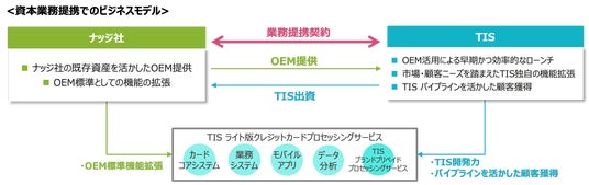 今回の資本業務提携契約締結により、ナッジはTISをOEM※1標準パートナーに採択し、ナッジで構築・展開しているスマホネイティブな次世代クレジットカード「Nudge」のシステム基盤をTISへ提供します。TISは、ナッジより提供されたシステム基盤にTIS独自の機能拡張を加え「ライト版クレジットカードプロセッシングサービス」としてクレジットカード会社及びクレジットカードの発行を検討する企業へサービスを展開します。