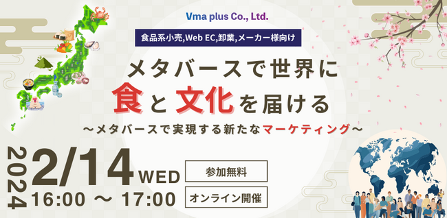 メタバースとWeb3.0に関するイベント企画やコンテンツ作成、そのディレクションを手がけるVma plus(ブイマプラス)株式会社(本社:東京都品川区、代表:津田徹)は、この度「食品関係の事業に携わる方」を対象にメタバース・Web3を活用した「マーケティング戦略」をテーマにお話しして参ります。