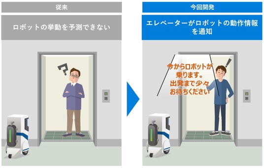 近年、オフィスビルや商業施設などにおいて、清掃や警備、搬送などさまざまなサービスロボットの導入が進んでおり、エレベーターと連携することで、フロア間の移動を自動化できる技術・サービスが実用化されています。さらに、人とロボットがエレベーターに同乗できる機能によって、効率良くフロア間の移動を行うことが可能となります。一方で、人とロボットがエレベーターに同乗する際には、一般的にエレベーターの利用者がロボットの動作に対して配慮することが求められますが、ロボットの動作情報がエレベーターの利用者に伝わらず、利用者が不安やストレスを感じやすいという課題があります。