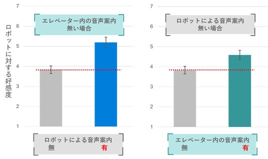 ・エレベーターもしくはロボットいずれの音声案内の場合でも、ロボットに対する利用者の好感度があがり、安心感を提供できることを確認