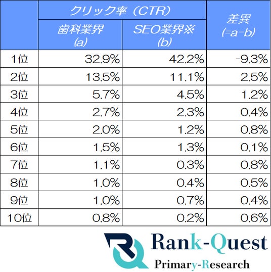 さらに、SEO業界向けの自社サイト(注2)のクリック率データと比較することで、歯科業界特有のクリック傾向やユーザー行動の違いも明らかにしています。