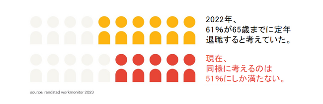 低迷する経済、高インフレ、政府援助の減少などにより、労働者の退職時期に対する考え方にも影響を及ぼしており回答者の70%が希望通りの早期引退は経済的な理由から難しいと答えています。2022年の調査では61%が65歳までに定年退職したいと答えていたのが、現在は51%に留まりました。一方で、単に労働対価の支払いだけを求めているとは限らず、回答者の3分の1近くが、目標達成や忙しくしていたいという社会的側面から仕事が不可欠だとも回答しています。