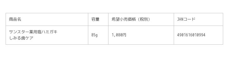 サンスターグループ オーラルケアカンパニーは、炎症抑制作用がある「生薬当帰(トウキ)エキス」をはじめとする薬用成分がバランス良く働き、口臭やネバつきを伴う歯肉炎・歯周炎を予防する「サンスター薬用塩ハミガキ」に、知覚過敏症状により歯がしみるのを防ぐ成分を加えた「サンスター薬用塩ハミガキ しみる歯ケア」を追加。2017年9月25日(月)より全国で発売いたします。