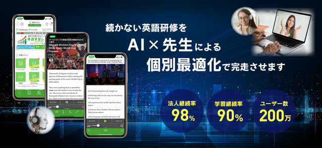 AI (アプリ) x 講師による個別最適化されたカリキュラムでビジネス英語が身につく英語研修サービスです。