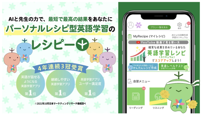 ・6技能全てを網羅した英語学習アプリ「レシピー」を利用した総合的な英語力の向上・AIにより、学習履歴や他学習者の成果の出た学習プロセスを分析し、一人一人に合わた日々の学習カリキュラムを生成