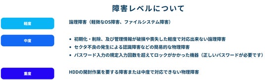 AIデータ株式会社が運営する「AOSデータ復旧サービスセンター」と提携し、対象商品について保証期間内で使用中に発生した障害のうち、「軽度の論理障害」と診断された場合、データ復旧作業を無償で実施します。