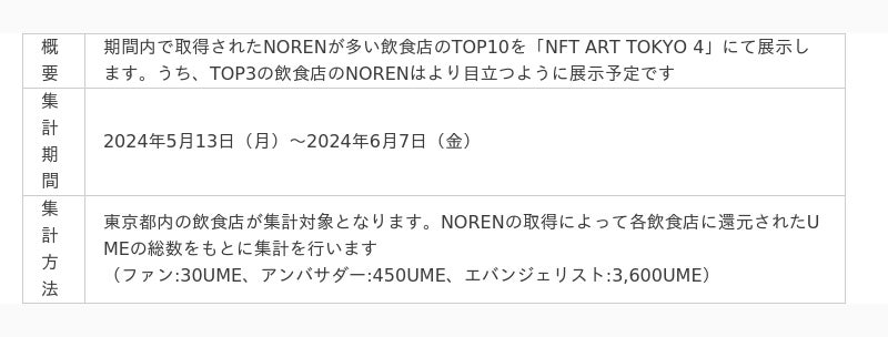 加えて、NOREN の開発背景にある”飲食店への貢献”を本イベントでも実現するために、ユーザーの NOREN 取得状況に応じた展示を行うことで、実際にユーザーから応援されている飲食店の可視化にも取り組みます。