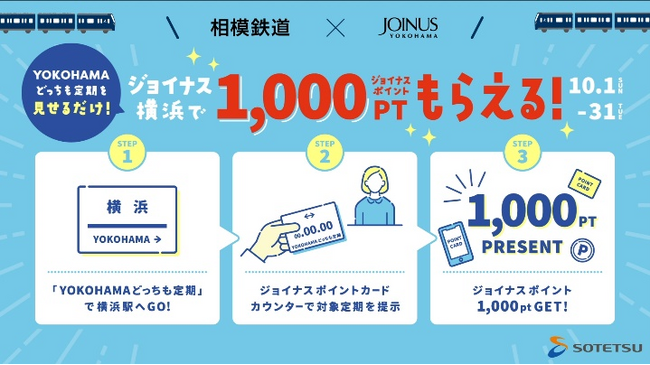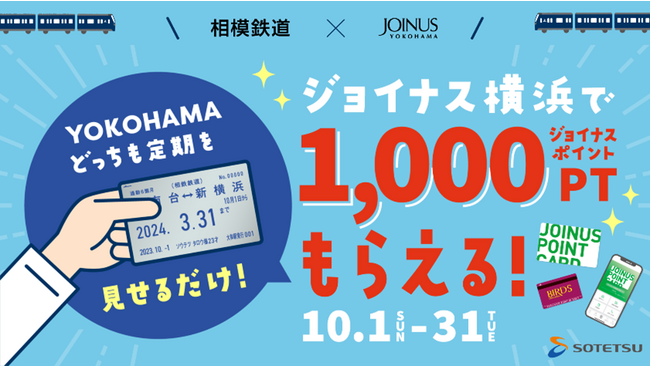 相鉄グループの(株)相鉄ビルマネジメント(本社・横浜市西区、社長・左藤 誠)が運営するジョイナスでは、10月1日(日)~10月31日(火)の間、ジョイナスで「YOKOHAMA どっちも定期」を提示するとジョイナスポイント1,000ポイントが付与されるキャンペーンを実施いたします。