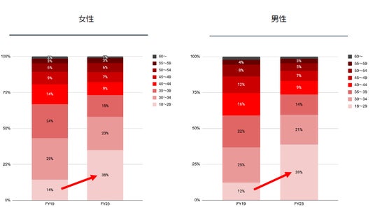 新型コロナウイルスの流行前と比較して、現在「オミカレ」の新規登録者数において、18~29歳の割合が急増中。