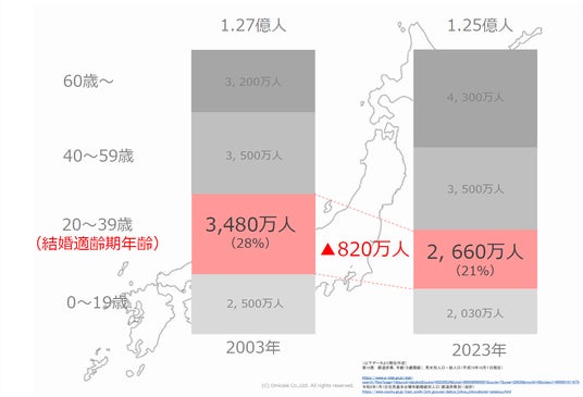 日本は2003年~2023年の10年間で、結婚適齢期とされる20~39歳の人口がおよそ820万人減少。