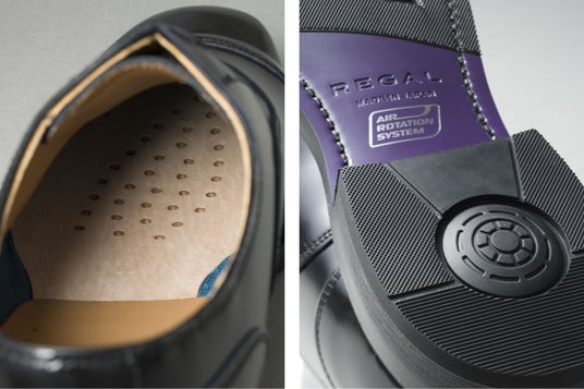 『リーガル エアローテーションシステム』とは、リーガルが開発したオリジナルの機能。歩行によって踏み込むたび、ソールのかかと部に埋め込まれたポンプが靴内に空気を送り込み、循環させます。グッドイヤーウエルト式製法でこの高機能ソールを組み込んだシューズは、透吸湿性にも優れ、常に爽やかな履き心地をキープしてくれます。