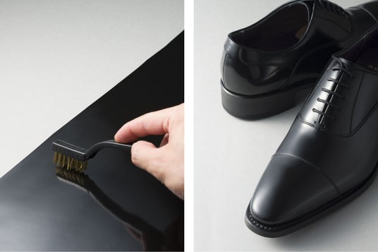 姫路を拠点としグローバル基準であるLWG認証を取得するタンナ、山陽が開発した『スクラッチタフレザー』は、自己修復能力を備える革。表面についた軽い引っかき傷は時間の経過とともに徐々に薄くなり、元の状態近くまで戻っていきます。特に傷がつきやすい爪先とかかと部分にこのレザーを施したシューズは、タフな耐久性を誇ります。