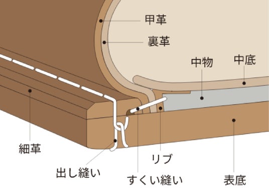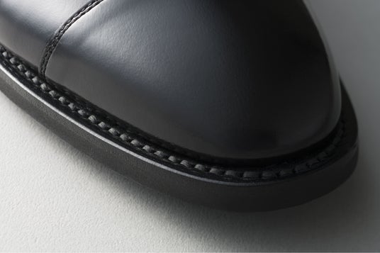 19世紀後半にアメリカで開発された、グッドイヤーウエルト式製法。甲革と中底、細革をすくい縫いし、次にその部分とアウトソールを縫い付ける2段階の工程によって作られます。この製法を施された靴は、足にフィットしやすくて履き心地が良く、長持ちして修理もしやすいため、高級靴を中心に長く用いられてきました。