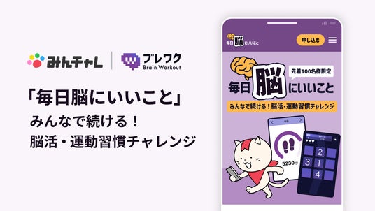 習慣化アプリ「みんチャレ」の開発、運営を手がけるエーテンラボ株式会社(本社:東京都中央区、 代表取締役:長坂 剛)は、Theoria technologies株式会社(本社:東京都千代田区、代表取締役CEO:内藤 景介、以下テオリア)と共に、認知機能低下予防や健康寿命の延伸を目指し、誰もが気軽に脳と身体の健康づくりに取り組める「毎日脳にいいこと」チャレンジの参加者募集を本日より開始します。