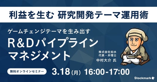 最先端の自然言語処理AIを活用した情報収集サービス『Anews・Astrategy』を提供するストックマーク株式会社(以下、「当社」)はオンラインセミナー『ゲームチェンジテーマを生み出すR&Dパイプラインマネジメント』を3月18日(月) に開催致します。▼オンラインセミナーの詳細と視聴登録はこちら▼