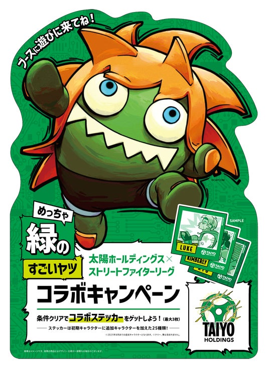 ブースでは、『ストリートファイター6』コラボステッカーを数量限定で初めて配布します。『ストリートファイター6』コラボステッカーは、太陽ホールディングスのコーポレートカラーである緑で統一した限定デザインになっており、全部で25種のキャラクターステッカーを用意しています。本ステッカーはミッションの達成に応じて配布します。ミッションは全部で3つあり、全てクリアすることで、おひとり様最大3枚のコラボステッカーを無料で取得することができます。また、『ストリートファイター6』とコラボした太陽ホールディングスの会社案内パンフレットも数量限定で配布します。ぜひ、お越しください。