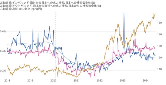 - 「海外から日本」および「日本から海外」への仕事検索は、2023年以降為替の影響を大きく受けている。