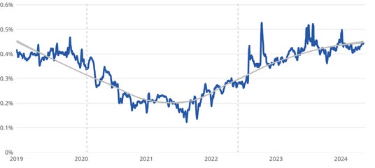 データは7日移動平均、2019年1月1日-2024年5月8日。季節調整済。灰色線はトレンド線。