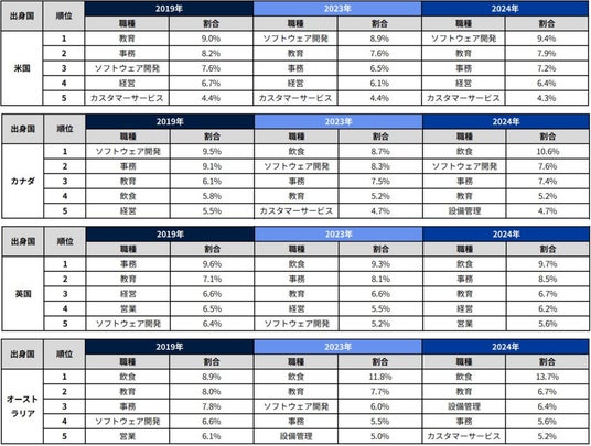 - 職種カテゴリ別の関心を見ると、2023年と2024年(1~4月)は米国では「ソフトウェア開発」、カナダ・英国・オーストラリアでは「飲食」がそれぞれ1位となっている。