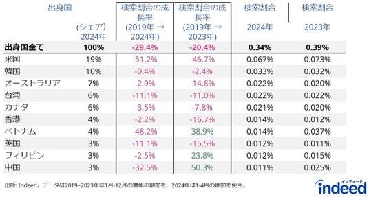 また、2019年と比較し2023年はベトナム・フィリピン・中国から日本への仕事検索割合は増加していましたが、2024年(1~4月)はいずれの国も減少しており、ベトナムは48.2%、中国は32.5%、フィリピンは2.5%の減少となりました。