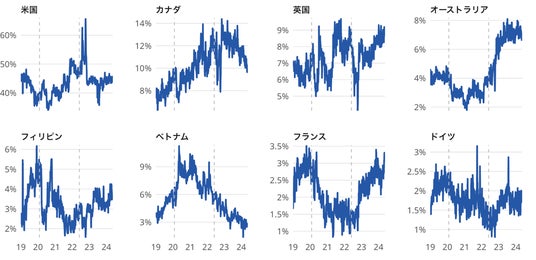 日本から海外への仕事検索全体に占める関心先上位8カ国(米国・カナダ・英国・オーストラリア・フィリピン・ベトナム・フランス・ドイツ)の仕事検索割合の推移を調べました。コロナ禍後の2022年以降を年単位で見ると、米国は2022年と比較し2023年および2024年(1~4月)は減少しています。カナダは2022年と比較し2023年は増加しましたが2024年(1~4月)は減少となっています。一方で英国、オーストラリアは2022年と比較し2023年および2024年(1~4月)は増加が見られます。
