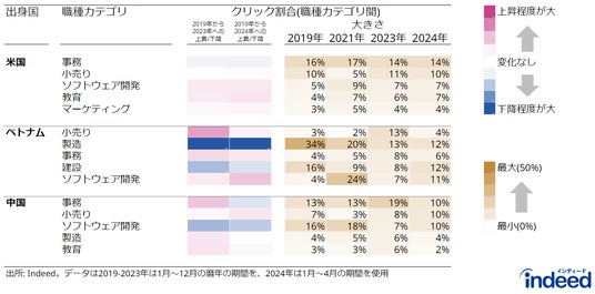 Indeed上で2024年の「海外から日本」への仕事検索割合が最も高い米国と、日本の外国人労働者の出身国上位2カ国のベトナム・中国(※1)それぞれの求職者について、日本の求人への職種別の関心を明らかにするため、求人の職種カテゴリ別のクリック割合を分析しました。各国で2023年にクリック割合が高かった上位職種カテゴリ5つを比較すると、特にベトナムからの職種カテゴリの関心に大きな変化が見られました。ベトナムの「製造」へのクリック割合は2019年は34%であったのに対し、2023年は13%と大きく減少しました。2024年は、1~4月までの限定的な結果となりますが、12%となっており減少傾向が続いていると見られます。一方で「ソフトウェア開発」への関心は2019年の4%から2023年には7%に増加しており、2024年(1~4月)では11%と増加傾向にあります。米国ではベトナム同様に「ソフトウェア開発」への関心は増加していますが、中国では減少傾向です。