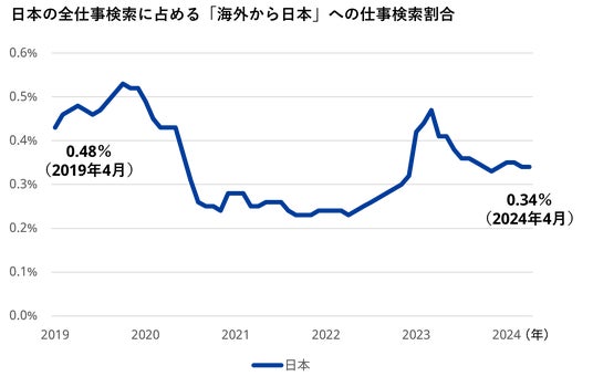 - 「海外から日本」への仕事検索割合は、2019年4月と比較し2024年同月は約3割減少。