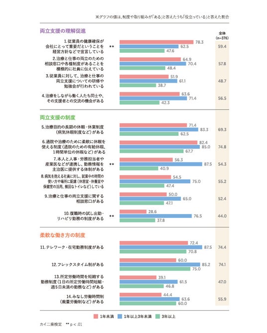・治療と仕事を両立する上で役立っている制度や取り組みについて、治療期間別に示した。