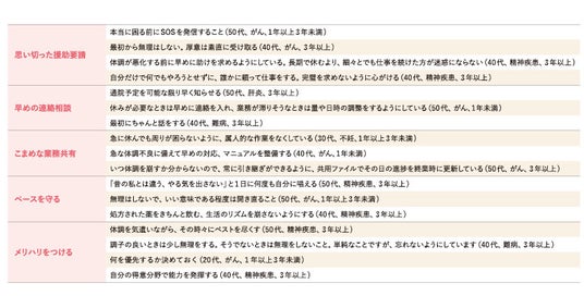 Q.適切な治療をしながら自分の望む就業を続けるために、あなたが心がけている「コツ」「工夫」があれば、具体的に教えてください。 〈自由記述から抜粋〉