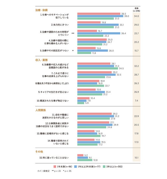 ・1年以上3年未満群は、全体的に他群より課題の選択率が高い。「1.仕事へのモチベーションが低下している」に加えて、治療・体調面の「3.治療や通院のための時間がとりにくい」「2.体力的にきつい」の選択が35%以上と多く、「5.治療やその副反応がつらい」も他群と比べて選択率が高い。