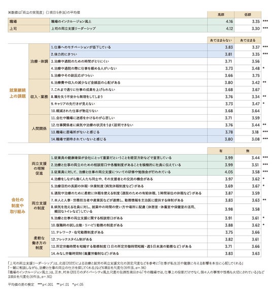 ・特に強い影響が確認されたのは、「上司の両立支援リーダーシップ」(「仕事が私生活や健康に与える影響を本当に心配してくれる」など6項目、6件法、α=.96)と、「職場のインクルージョン風土」(「今の職場では、仕事上の役割だけでなく、個々人の事情や性格も大切にされている」など3項目、6件法、α=93)である。それぞれについて、高群と低群の「両立の実現度」を比較したところ、高群が低群にくらべて有意に高い結果が見られた。