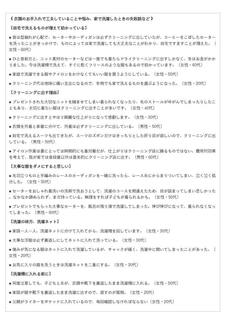 衣類のお手入れで工夫していることや悩み、家で洗濯したときの失敗談などを自由回答で教えてもらいました。「自宅の洗濯機で洗えるものが増えているので、購入時から意識的にそういった服を選ぶ」という人が少なくないようでした。また、失敗談として多かったのが、「ティッシュやボールペンと一緒に洗濯してしまった」というものです。また、洗濯を担当している人にとって、裏返しのまま洗濯に出されることはすごくストレスなようです。気をつけましょう。