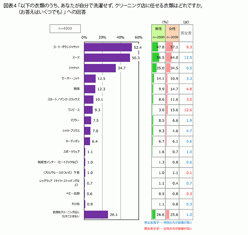 図表3と図表4を見比べると、図表3のほうが、女性の割合が高い項目が多いことが目につきます。クリーニング店に任せるものはそれほど男女に差はないが、自宅でのお手入れには男女で差があると言えそうです。