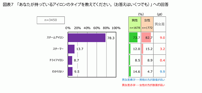 また、持っているアイロンのタイプを聞くと(図表7)、アイロン台などを利用して、プレスとスチームでシワをのばす「スチームアイロン」が78.3%とダントツで高く、「スチーマー」(アイロン台を利用せず、ハンガーなどにかけたままシワをのばすタイプ)や「ドライアイロン」(スチーム機能がついていないタイプ)はあまり普及していないことがわかります。