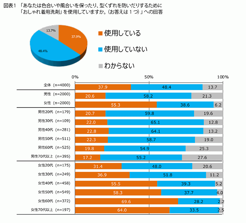 まず、おしゃれ着用洗剤を使用しているかを聞いたところ(図表1)、「使用している」と回答した人は37.9%、「使用していない」と回答した人は48.4%でした。これだけ見ると、「使用していない」人のほうが多いのですが、「わからない」と回答した人も13.7%います。