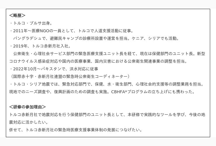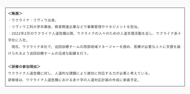 アジア大洋州地域や欧州など12か国から20人が参加し、ウクライナ武力紛争やトルコ・シリア地震において活動している現地の赤十字・赤新月社職員もいます。