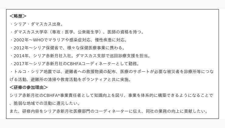 紛争や自然災害、複合災害などの人道支援の現場で活動している人を対象とし、人道支援を行う際に必要な